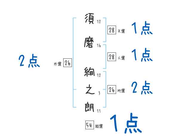 外運![]() | 須磨絢之朗さんの外運は26画の2つ星!波瀾万丈かも。信頼できる人を大事にしましょう。 生活面を象徴する運勢です。外部から受ける影響力を表し、結婚運、家庭運や職場、環境への順応性を表します。 |
