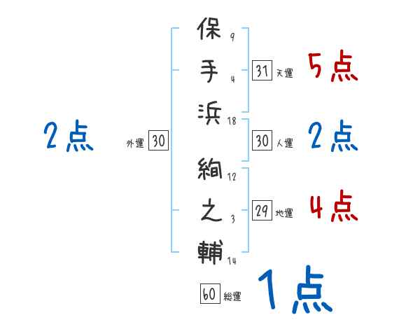 外運![]() | 保手浜絢之輔さんの外運は30画の2つ星!浮き沈みの激しさに注意しましょう。 生活面を象徴する運勢です。外部から受ける影響力を表し、結婚運、家庭運や職場、環境への順応性を表します。 |