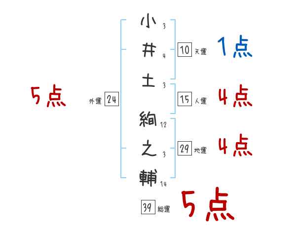 総運![]() | 小井土絢之輔さんの総運は39画の5つ星!社交性に優れ人望が厚い。人の上に立ち成功する。 あなたの人生を表す1番重要な運勢です。生涯を通じて影響する総合運となり、主に50歳以降の晩年期に影響を及ぼします。 |