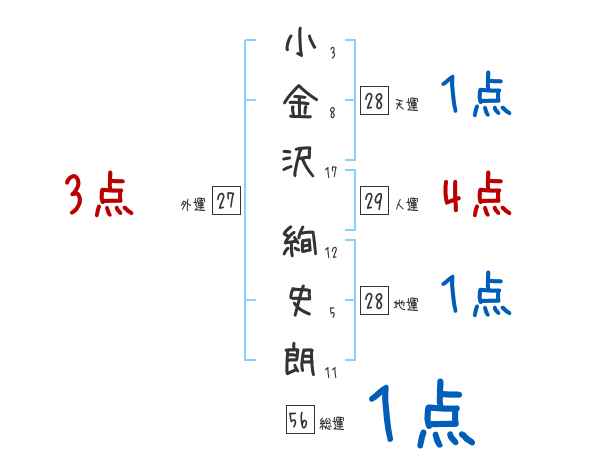 天運![]() | 小金沢絢史朗さんの天運は28画の1つ星!家庭環境に注意。スポーツで活躍できる能力があるかも。 家系が持つ宿命的な運勢を表します。祖先から受け継いだ苗字ですので自分の力が及びません。家柄を象徴します。 |