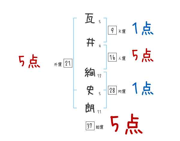 天運![]() | 瓦井絢史朗さんの天運は9画の1つ星!消極的で才能を発揮することが苦手なことも。周りの意見に耳を傾けましょう。 家系が持つ宿命的な運勢を表します。祖先から受け継いだ苗字ですので自分の力が及びません。家柄を象徴します。 |