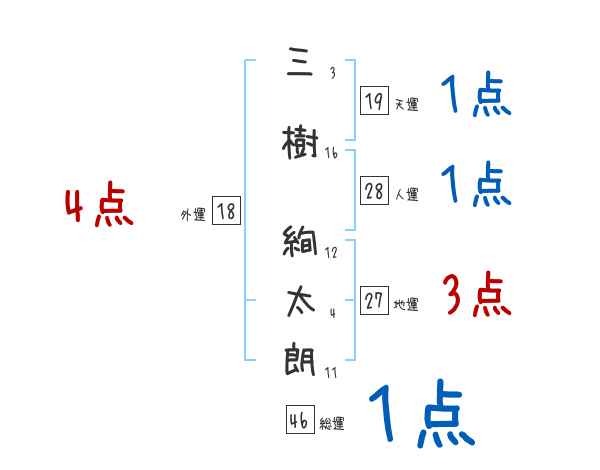 天運![]() | 三樹絢太朗さんの天運は19画の1つ星!優れた才能を持ちますが、協調性が足りないことも。周りの人と協力する事を意識しましょう。 家系が持つ宿命的な運勢を表します。祖先から受け継いだ苗字ですので自分の力が及びません。家柄を象徴します。 |