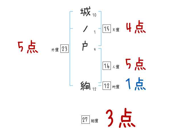 人運![]() | 城ノ戸絢さんの人運は16画の5つ星!人望が厚く大きく発展する。逆転成功が見える。 性格や才能などを表す2番目に重要な運勢です。人間関係や協調性、社会的な成功に影響します。主に20歳から50歳ぐらいまでの中年期の運勢を表します。 |