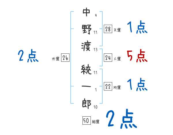 天運![]() | 中野渡統一郎さんの天運は28画の1つ星!家庭環境に注意。スポーツで活躍できる能力があるかも。 家系が持つ宿命的な運勢を表します。祖先から受け継いだ苗字ですので自分の力が及びません。家柄を象徴します。 |