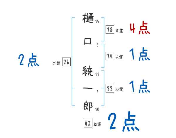 天運![]() | 樋口統一郎さんの天運は18画の4つ星!情熱的で剛気。忍耐力があり信頼される。 家系が持つ宿命的な運勢を表します。祖先から受け継いだ苗字ですので自分の力が及びません。家柄を象徴します。 |