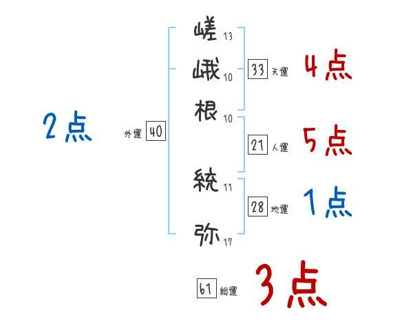 天運![]() | 嵯峨根統弥さんの天運は33画の4つ星!権力志向でプライドが高い。勇気があり運を切り開き成功する。 家系が持つ宿命的な運勢を表します。祖先から受け継いだ苗字ですので自分の力が及びません。家柄を象徴します。 |