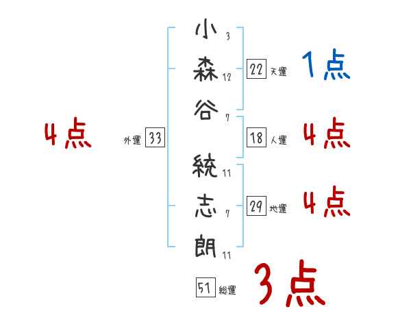 外運![]() | 小森谷統志朗さんの外運は33画の4つ星!権力志向でプライドが高い。勇気があり運を切り開き成功する。 生活面を象徴する運勢です。外部から受ける影響力を表し、結婚運、家庭運や職場、環境への順応性を表します。 |