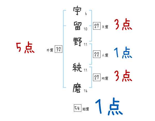 外運![]() | 宇留野統磨さんの外運は32画の5つ星!柔軟性があり成功する。チャンスが多く金運が良い。 生活面を象徴する運勢です。外部から受ける影響力を表し、結婚運、家庭運や職場、環境への順応性を表します。 |