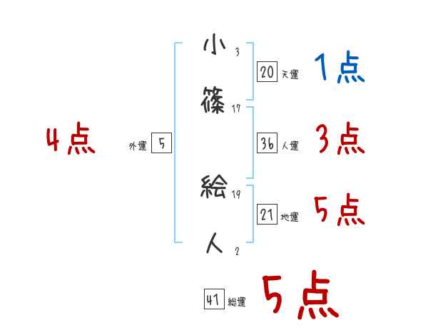 外運![]() | 小篠絵人さんの外運は5画の4つ星!健康で安泰。協調性に優れ、財産に恵まれる。 生活面を象徴する運勢です。外部から受ける影響力を表し、結婚運、家庭運や職場、環境への順応性を表します。 |