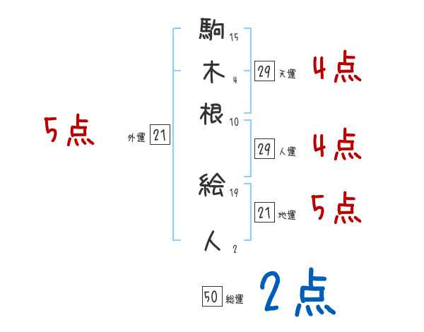 天運![]() | 駒木根絵人さんの天運は29画の4つ星!完全主義で才能がある。厳格な心の持ち主。 家系が持つ宿命的な運勢を表します。祖先から受け継いだ苗字ですので自分の力が及びません。家柄を象徴します。 |