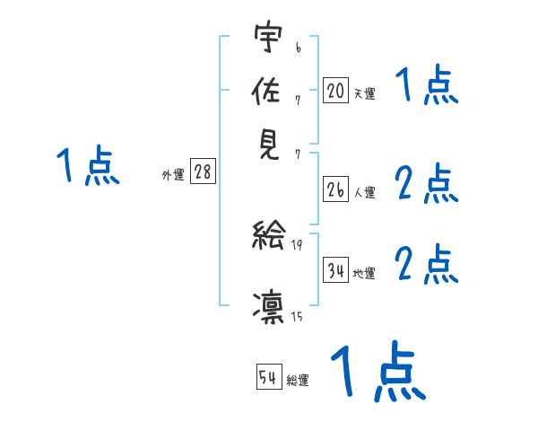 総運![]() | 宇佐見絵凛さんの総運は54画の1つ星!トラブルが多いかも。周りをよく見て協調して過ごしましょう。 あなたの人生を表す1番重要な運勢です。生涯を通じて影響する総合運となり、主に50歳以降の晩年期に影響を及ぼします。 |