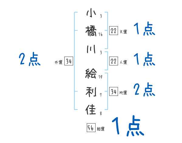 総運![]() | 小橋川絵利佳さんの総運は56画の1つ星!消極的で無気力になりがち。誠実な気持ちが必要でしょう。 あなたの人生を表す1番重要な運勢です。生涯を通じて影響する総合運となり、主に50歳以降の晩年期に影響を及ぼします。 |