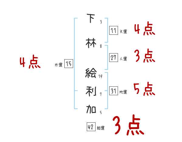 天運![]() | 下林絵利加さんの天運は11画の4つ星!着実に富や地位を得る幸運な人生。 家系が持つ宿命的な運勢を表します。祖先から受け継いだ苗字ですので自分の力が及びません。家柄を象徴します。 |