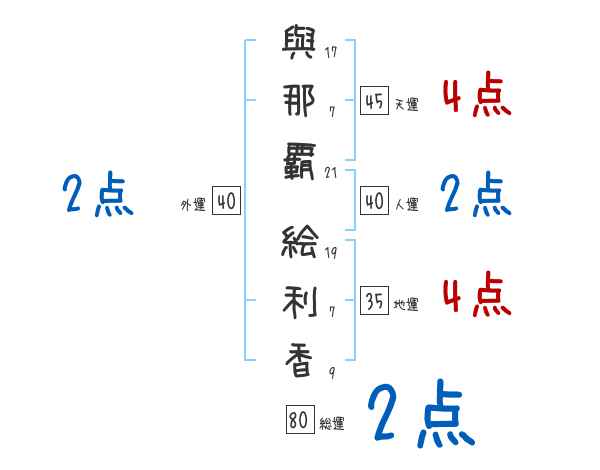 天運![]() | 與那覇絵利香さんの天運は45画の4つ星!もくもくと物事を進め達成する。地味な努力家。 家系が持つ宿命的な運勢を表します。祖先から受け継いだ苗字ですので自分の力が及びません。家柄を象徴します。 |