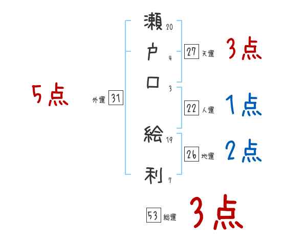 総運![]() | 瀬戸口絵利さんの総運は53画の3つ星!やや見栄っ張りで虚栄心がある。散財に注意。 あなたの人生を表す1番重要な運勢です。生涯を通じて影響する総合運となり、主に50歳以降の晩年期に影響を及ぼします。 |