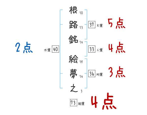 総運![]() | 根路銘絵夢之さんの総運は73画の4つ星!天徳のある人生。散財に注意すれば晩年幸福。 あなたの人生を表す1番重要な運勢です。生涯を通じて影響する総合運となり、主に50歳以降の晩年期に影響を及ぼします。 |