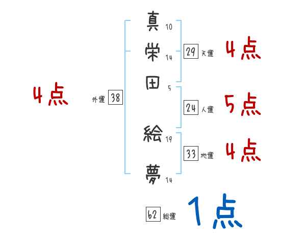 天運![]() | 真栄田絵夢さんの天運は29画の4つ星!完全主義で才能がある。厳格な心の持ち主。 家系が持つ宿命的な運勢を表します。祖先から受け継いだ苗字ですので自分の力が及びません。家柄を象徴します。 |