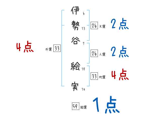 天運![]() | 伊勢谷絵実さんの天運は26画の2つ星!波瀾万丈かも。信頼できる人を大事にしましょう。 家系が持つ宿命的な運勢を表します。祖先から受け継いだ苗字ですので自分の力が及びません。家柄を象徴します。 |