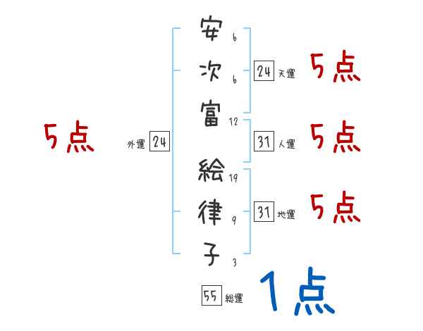 天運![]() | 安次富絵律子さんの天運は24画の5つ星!家庭運が良く順調な人生。金運にも恵まれる。 家系が持つ宿命的な運勢を表します。祖先から受け継いだ苗字ですので自分の力が及びません。家柄を象徴します。 |