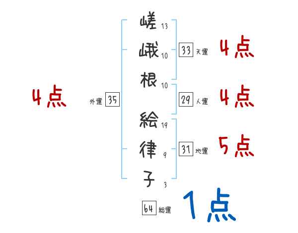 天運![]() | 嵯峨根絵律子さんの天運は33画の4つ星!権力志向でプライドが高い。勇気があり運を切り開き成功する。 家系が持つ宿命的な運勢を表します。祖先から受け継いだ苗字ですので自分の力が及びません。家柄を象徴します。 |