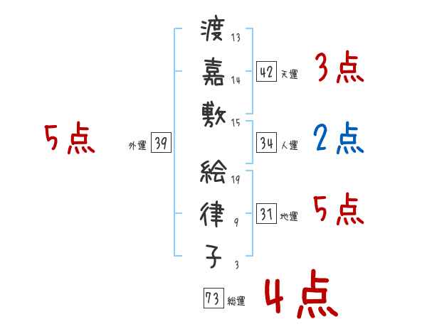 外運![]() | 渡嘉敷絵律子さんの外運は39画の5つ星!社交性に優れ人望が厚い。人の上に立ち成功する。 生活面を象徴する運勢です。外部から受ける影響力を表し、結婚運、家庭運や職場、環境への順応性を表します。 |