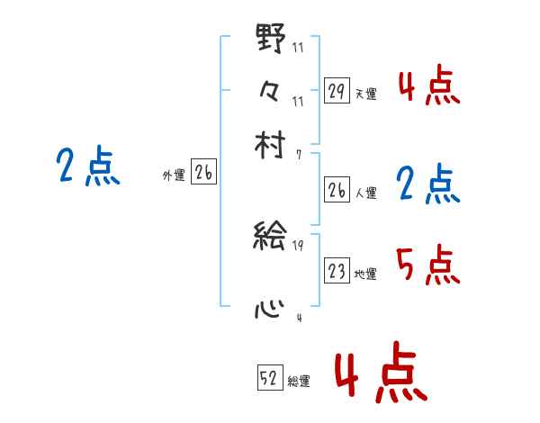 外運![]() | 野々村絵心さんの外運は26画の2つ星!波瀾万丈かも。信頼できる人を大事にしましょう。 生活面を象徴する運勢です。外部から受ける影響力を表し、結婚運、家庭運や職場、環境への順応性を表します。 |