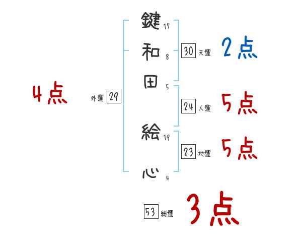 総運![]() | 鍵和田絵心さんの総運は53画の3つ星!やや見栄っ張りで虚栄心がある。散財に注意。 あなたの人生を表す1番重要な運勢です。生涯を通じて影響する総合運となり、主に50歳以降の晩年期に影響を及ぼします。 |