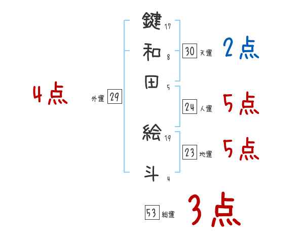 総運![]() | 鍵和田絵斗さんの総運は53画の3つ星!やや見栄っ張りで虚栄心がある。散財に注意。 あなたの人生を表す1番重要な運勢です。生涯を通じて影響する総合運となり、主に50歳以降の晩年期に影響を及ぼします。 |