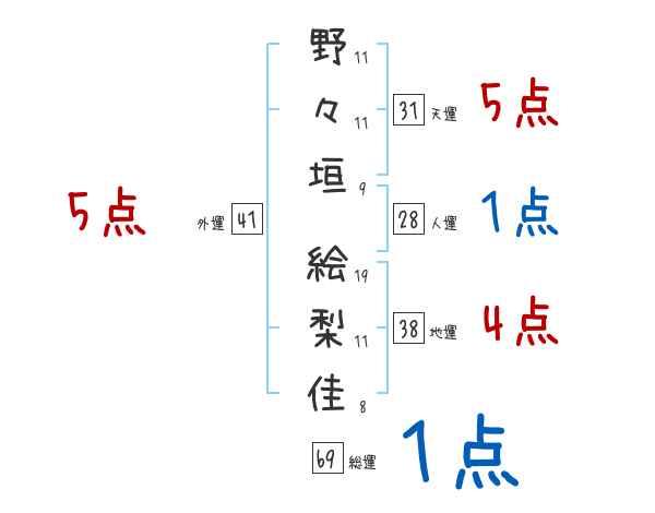 総運![]() | 野々垣絵梨佳さんの総運は69画の1つ星!不満を感じやすい傾向が。ストレスを貯めないように注意しましょう。 あなたの人生を表す1番重要な運勢です。生涯を通じて影響する総合運となり、主に50歳以降の晩年期に影響を及ぼします。 |