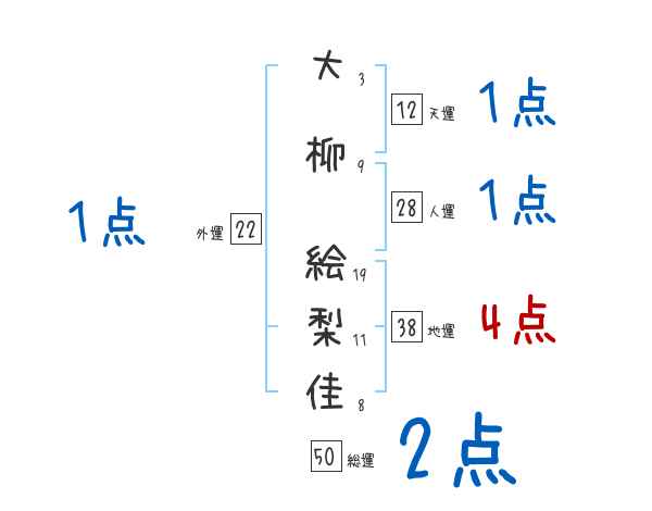 総運![]() | 大柳絵梨佳さんの総運は50画の2つ星!浮き沈みが激しく不安定。しりすぼみに衰退しやすいので注意しましょう。 あなたの人生を表す1番重要な運勢です。生涯を通じて影響する総合運となり、主に50歳以降の晩年期に影響を及ぼします。 |
