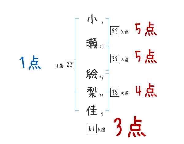 外運![]() | 小瀬絵梨佳さんの外運は22画の1つ星!努力することが苦手ないっぽう手先が器用。芸術性にも優れる。 生活面を象徴する運勢です。外部から受ける影響力を表し、結婚運、家庭運や職場、環境への順応性を表します。 |