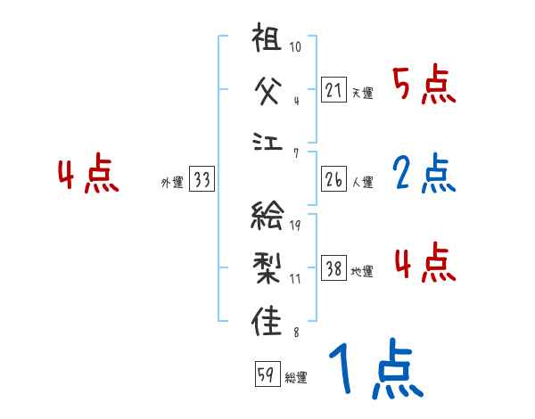 天運![]()  | 祖父江絵梨佳さんの天運は21画の5つ星!統率力がある。独立し成功する。名誉を手に入れる。 家系が持つ宿命的な運勢を表します。祖先から受け継いだ苗字ですので自分の力が及びません。家柄を象徴します。 |