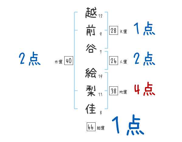 外運![]() | 越前谷絵梨佳さんの外運は40画の2つ星!自信過剰で物事に固執するためトラブルに注意。 生活面を象徴する運勢です。外部から受ける影響力を表し、結婚運、家庭運や職場、環境への順応性を表します。 |