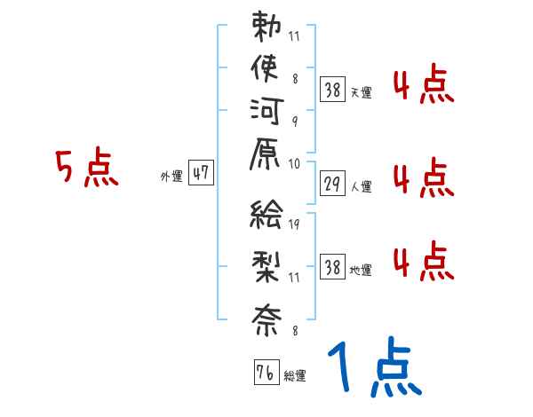 総運![]() | 勅使河原絵梨奈さんの総運は76画の1つ星!離散に注意。劣等感を感じ孤立しやすい傾向があるかも。 あなたの人生を表す1番重要な運勢です。生涯を通じて影響する総合運となり、主に50歳以降の晩年期に影響を及ぼします。 |