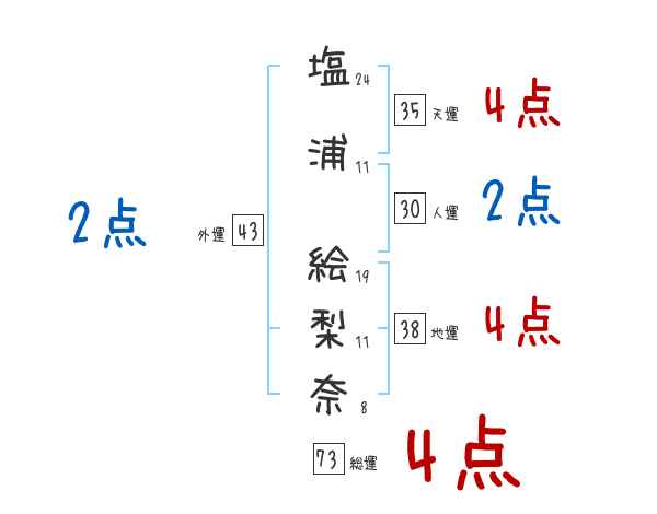 総運![]() | 塩浦絵梨奈さんの総運は73画の4つ星!天徳のある人生。散財に注意すれば晩年幸福。 あなたの人生を表す1番重要な運勢です。生涯を通じて影響する総合運となり、主に50歳以降の晩年期に影響を及ぼします。 |