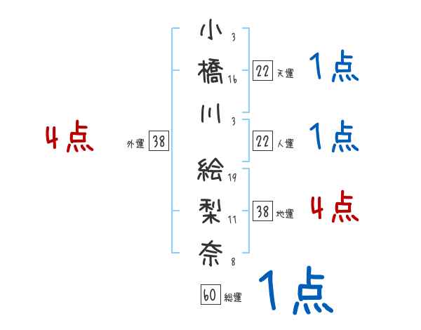 人運![]() | 小橋川絵梨奈さんの人運は22画の1つ星!努力することが苦手ないっぽう手先が器用。芸術性にも優れる。 性格や才能などを表す2番目に重要な運勢です。人間関係や協調性、社会的な成功に影響します。主に20歳から50歳ぐらいまでの中年期の運勢を表します。 |