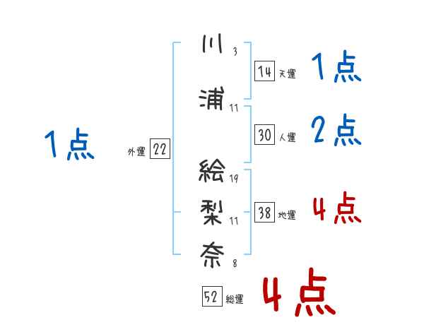 外運![]() | 川浦絵梨奈さんの外運は22画の1つ星!努力することが苦手ないっぽう手先が器用。芸術性にも優れる。 生活面を象徴する運勢です。外部から受ける影響力を表し、結婚運、家庭運や職場、環境への順応性を表します。 |