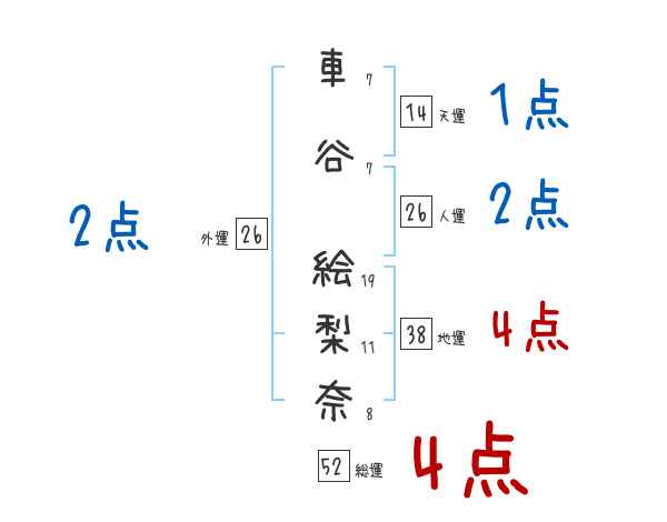 外運![]() | 車谷絵梨奈さんの外運は26画の2つ星!波瀾万丈かも。信頼できる人を大事にしましょう。 生活面を象徴する運勢です。外部から受ける影響力を表し、結婚運、家庭運や職場、環境への順応性を表します。 |