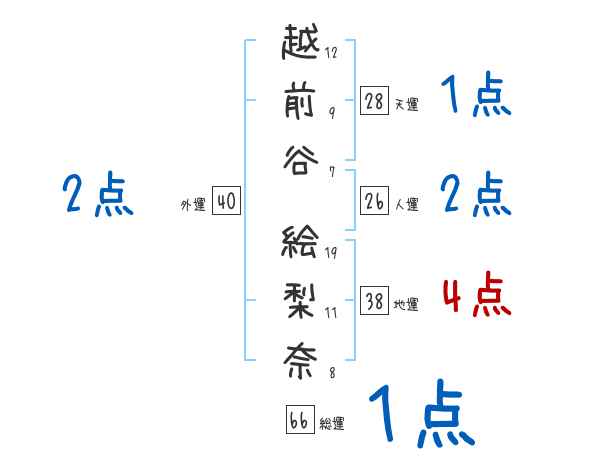 天運![]() | 越前谷絵梨奈さんの天運は28画の1つ星!家庭環境に注意。スポーツで活躍できる能力があるかも。 家系が持つ宿命的な運勢を表します。祖先から受け継いだ苗字ですので自分の力が及びません。家柄を象徴します。 |