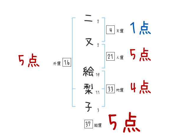 人運![]() | 二又絵梨子さんの人運は21画の5つ星!統率力がある。独立し成功する。名誉を手に入れる。 性格や才能などを表す2番目に重要な運勢です。人間関係や協調性、社会的な成功に影響します。主に20歳から50歳ぐらいまでの中年期の運勢を表します。 |