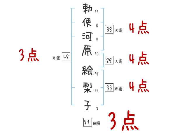 外運![]() | 勅使河原絵梨子さんの外運は42画の3つ星!病気に注意。多芸であるが消極的でおとなしい。 生活面を象徴する運勢です。外部から受ける影響力を表し、結婚運、家庭運や職場、環境への順応性を表します。 |