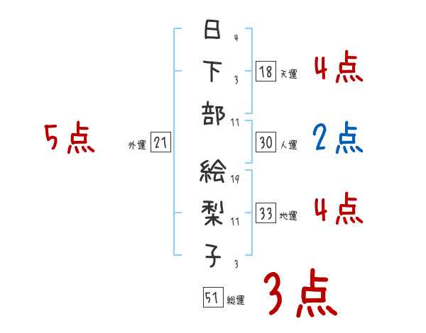 天運![]() | 日下部絵梨子さんの天運は18画の4つ星!情熱的で剛気。忍耐力があり信頼される。 家系が持つ宿命的な運勢を表します。祖先から受け継いだ苗字ですので自分の力が及びません。家柄を象徴します。 |