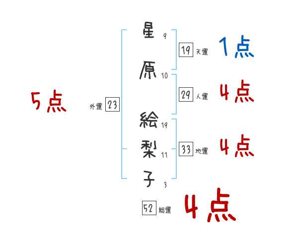 人運![]() | 星原絵梨子さんの人運は29画の4つ星!完全主義で才能がある。厳格な心の持ち主。 性格や才能などを表す2番目に重要な運勢です。人間関係や協調性、社会的な成功に影響します。主に20歳から50歳ぐらいまでの中年期の運勢を表します。 |