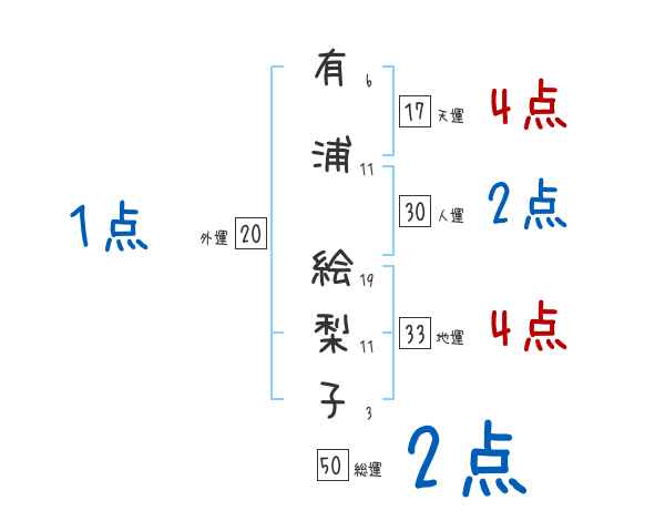 天運![]() | 有浦絵梨子さんの天運は17画の4つ星!積極的な行動力。地位を気づき財産を手に入れる。純粋な心と直感力。 家系が持つ宿命的な運勢を表します。祖先から受け継いだ苗字ですので自分の力が及びません。家柄を象徴します。 |