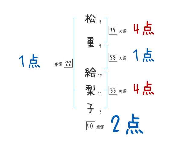 人運![]() | 松重絵梨子さんの人運は28画の1つ星!家庭環境に注意。スポーツで活躍できる能力があるかも。 性格や才能などを表す2番目に重要な運勢です。人間関係や協調性、社会的な成功に影響します。主に20歳から50歳ぐらいまでの中年期の運勢を表します。 |