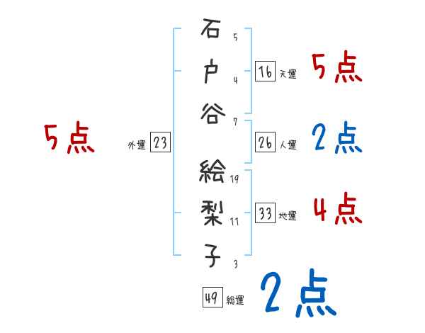 外運![]() | 石戸谷絵梨子さんの外運は23画の5つ星!想像力に優れ活力がある。一代で成功し名誉を手に入れる。 生活面を象徴する運勢です。外部から受ける影響力を表し、結婚運、家庭運や職場、環境への順応性を表します。 |