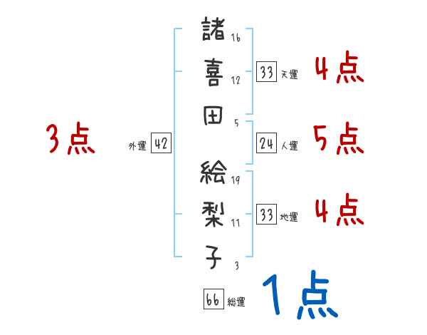 天運![]() | 諸喜田絵梨子さんの天運は33画の4つ星!権力志向でプライドが高い。勇気があり運を切り開き成功する。 家系が持つ宿命的な運勢を表します。祖先から受け継いだ苗字ですので自分の力が及びません。家柄を象徴します。 |