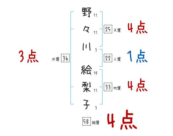 外運![]() | 野々川絵梨子さんの外運は36画の3つ星!先見性が豊かです。多少神経質で苦労することも。 生活面を象徴する運勢です。外部から受ける影響力を表し、結婚運、家庭運や職場、環境への順応性を表します。 |