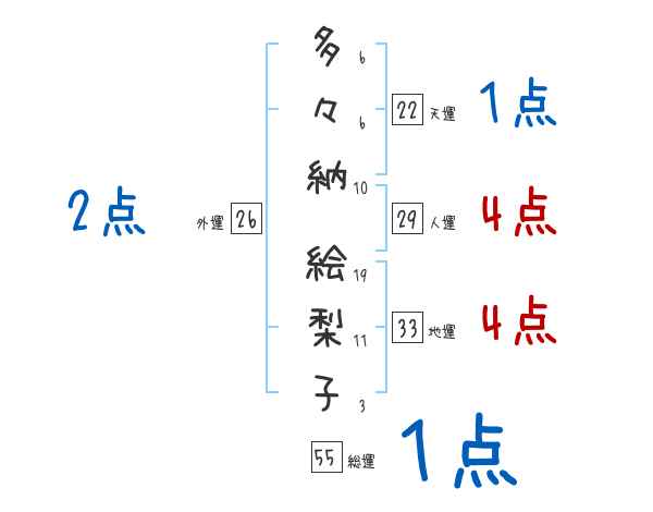 総運![]() | 多々納絵梨子さんの総運は55画の1つ星!欲張りな性格で軽率な行動に注意しましょう。病気に気をつけて。 あなたの人生を表す1番重要な運勢です。生涯を通じて影響する総合運となり、主に50歳以降の晩年期に影響を及ぼします。 |