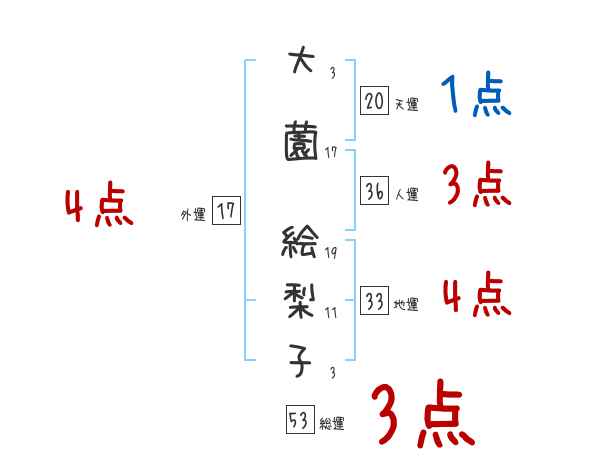 外運![]() | 大薗絵梨子さんの外運は17画の4つ星!積極的な行動力。地位を気づき財産を手に入れる。純粋な心と直感力。 生活面を象徴する運勢です。外部から受ける影響力を表し、結婚運、家庭運や職場、環境への順応性を表します。 |